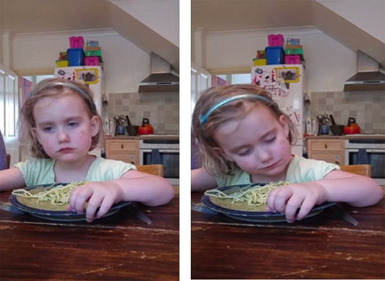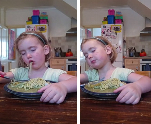 短暂的平衡很快被打破,手里的叉子掉在盘子上,小女孩也惊醒了,若无其事地继续吃面,继续打瞌睡。第二次惊醒的时候,她的脑袋差点栽到桌面上,蓝色的眼睛睁得大大的。一旁洞察一切的母亲问她需不需要去睡觉,而她坚定地摇了摇头,半睡半醒间又往嘴里扒了一大口面条。挣扎着把整盘意大利面吃完后,小女孩终于摇摇晃晃地进入了梦乡。