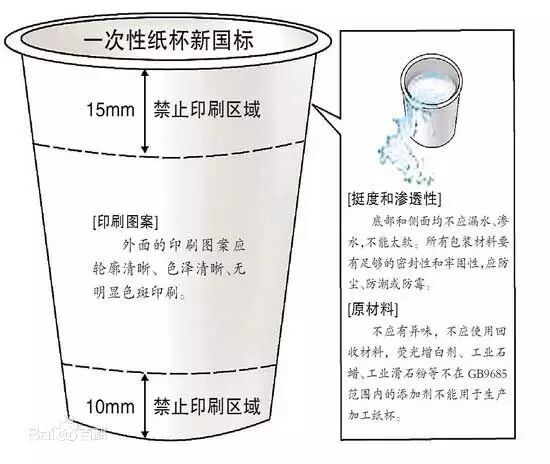 国标规定,纸杯杯口距杯身15毫米以内,杯底距杯身10毫米以内,不能有印刷图案。这样是为了避免油墨进入口中,也是为了避免杯子叠放的时候油墨会污染杯子的内壁。但是,王先生所购买的纸杯并没有达到这方面的要求。