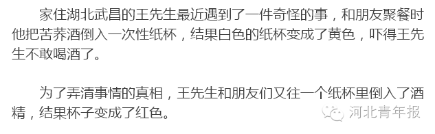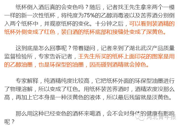 其实,早在2012年6月份出台的《纸杯》国家标准中规定,纸杯必须使用环保油墨。使用环保型油墨的纸杯,遇到酒精会掉色,这类纸杯需要明确标注“不得盛装酒精类饮品”,但日常生活中很多市民并未注意。