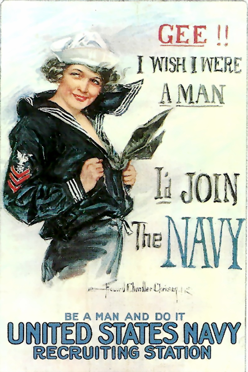 美女形象第一次被运用到征兵中也是在一战时期,这张海报是要招海军。画面中写道:如果我是个男人,我就加入海军。