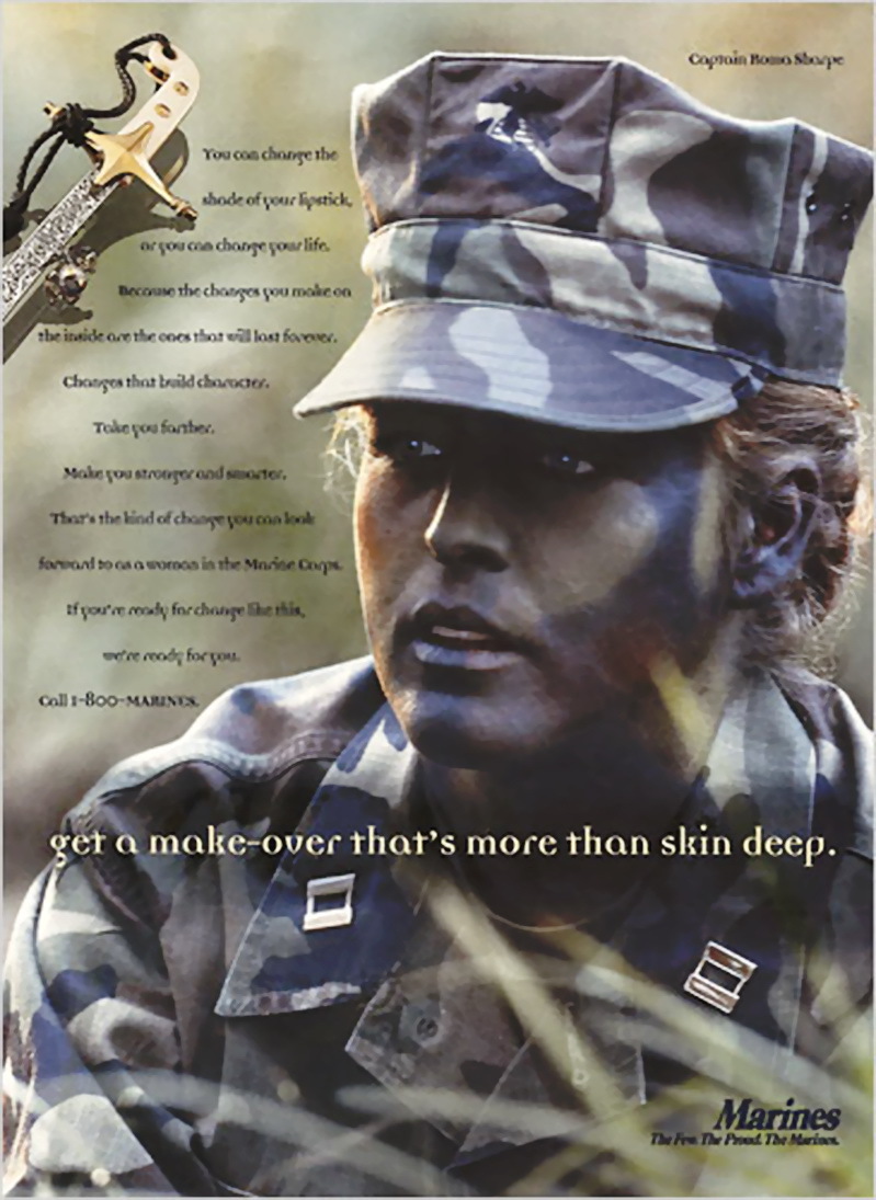 又是美国的海军,他们想要女兵。所以在1995年发布了这张海报,上边写着:要改变人生,不要只改变外表。