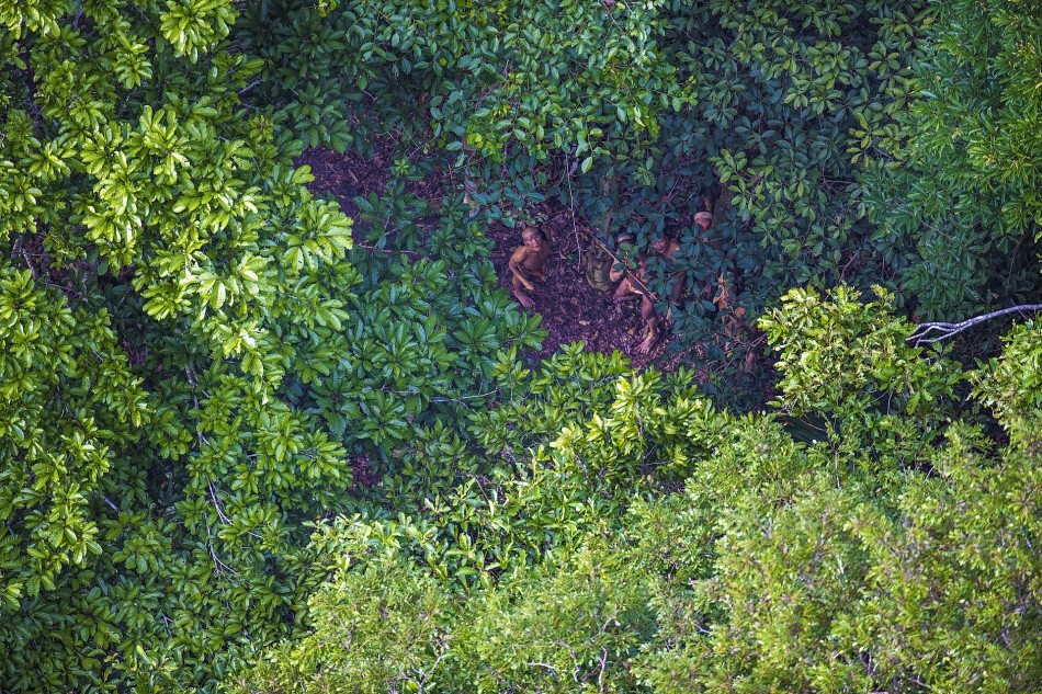 部落里的男人们藏在丛林中,警惕地看着空中的直升机。