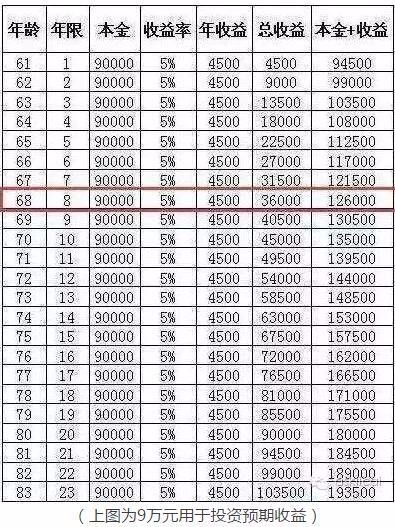 假如一次性把这9万交给ZF,每月领养老金,每年的养老金估计有5%的涨幅(依据前史规则)。也就是说,大概第8年的时分,投资收益+本金与领取到的养老金大概持平,也就是说自己到68岁摆布的时分,能够把养老金赚回来。