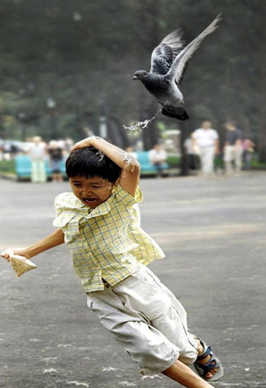 听说小孩子都喜欢喂喂鸽子逗逗鸟,不知道这次是不是给图中的小孩留下了心理阴影……