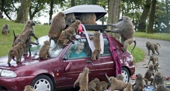 英国诺斯雷野生动物园的游客遭到警告,因为这里出现了一群会“洗劫”你车顶旅行箱的“强盗狒狒”。他们对箱子内的东西都很好奇,包括衣服、鞋子甚至内衣,都是这些狒狒的“寻宝”对象。
