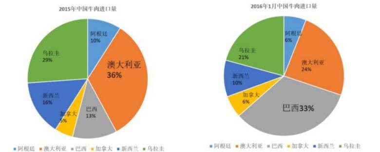 根据MIG集团数据,2016年1月,巴西成为中国最大的牛肉来源国,份额从2015年的13%猛增至33%,而澳大利亚退居第二。